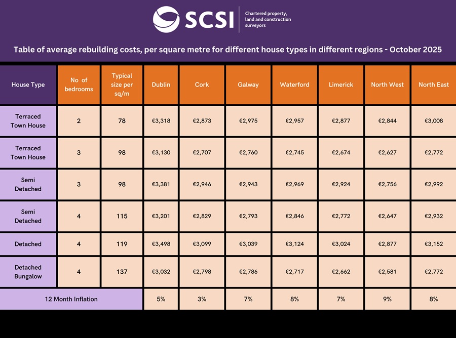 The SCSI points out that the rebuild figures are based on estate type houses and people with one-off homes or period properties are advised to contact their local chartered surveyor. A list of chartered quantity and building surveyors who carry out these assessments is also available on the SCSI website.