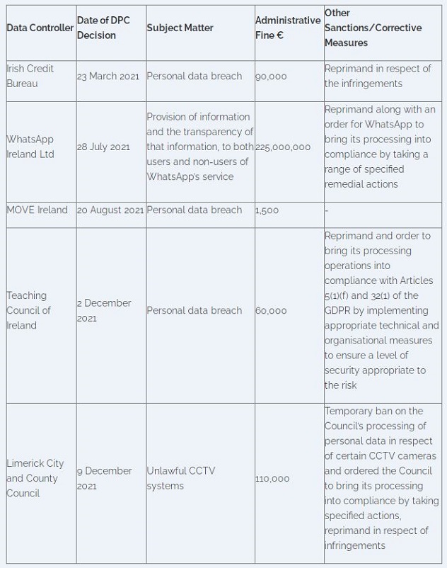 In 2021, the DPC imposed the below sanctions of fines and corrective measures.